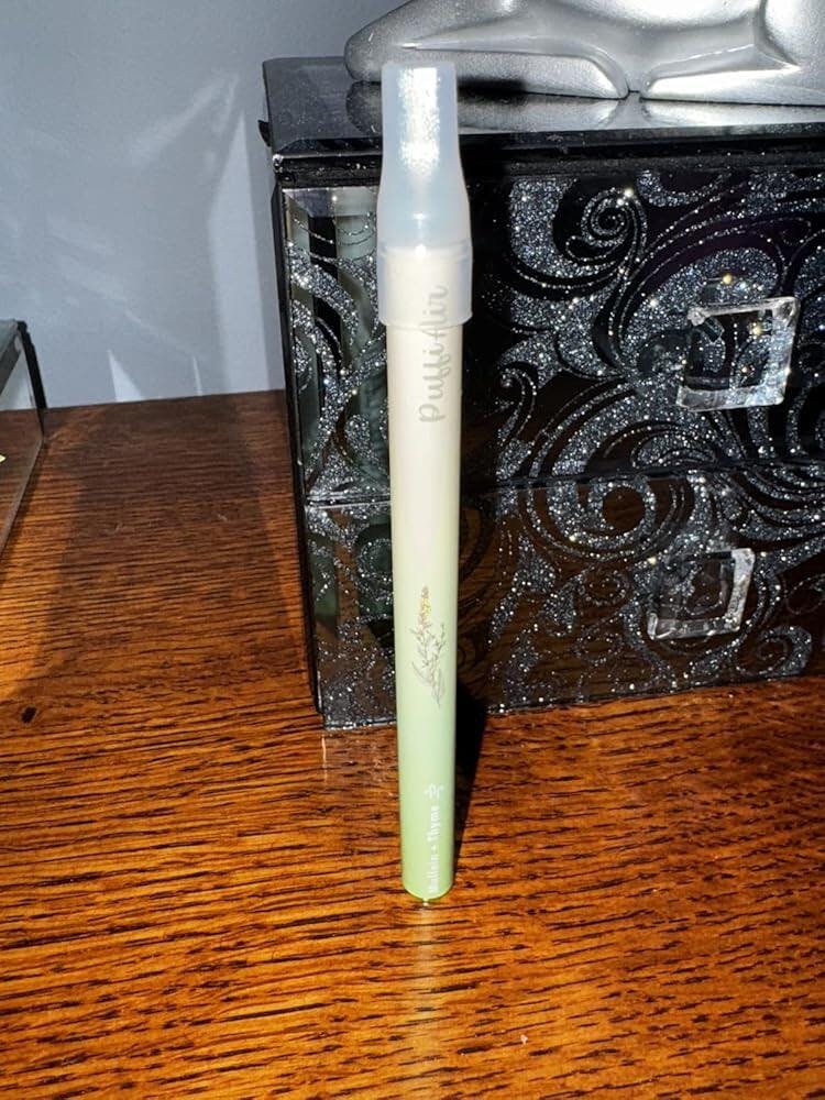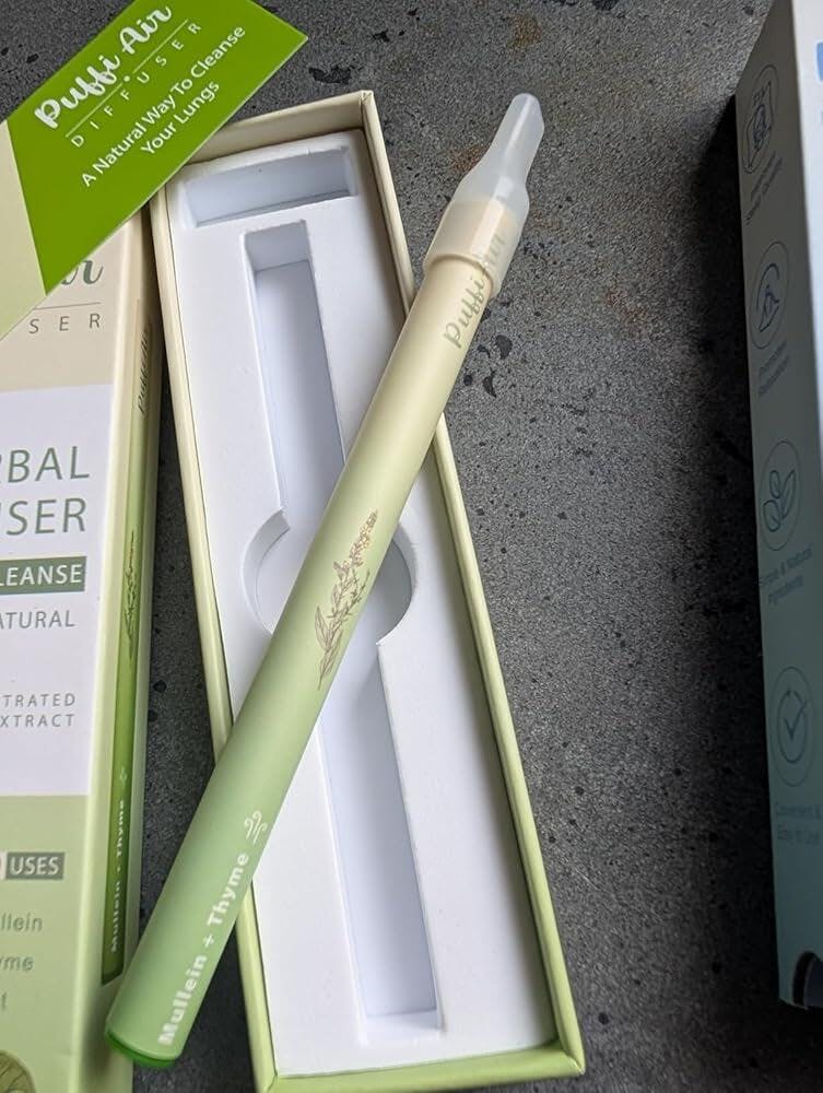 It’s a slim, pen-shaped aroma diffuser designed to support people who want to cut down or quit smoking. Instead of nicotine and smoke, it delivers a gentle herbal vapor with minty, plant-based notes.